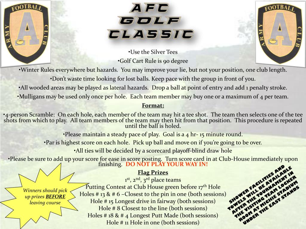 Use the Silver Tees • Golf Cart Rule is 90 degree • Winter Rules everywhere but hazards. You may improve your lie, but not your position, one club length. • Don’t waste time looking for lost balls. Keep pace with the group in front of you. • All wooded areas may be played as lateral hazards. Drop a ball at point of entry and add 1 penalty stroke. • Mulligans may be used only once per hole. Each team member may buy one or a maximum of 4 per team. • Format: • 4-person Scramble: On each hole, each member of the team may hit a tee shot. The team then selects one of the tee shots from which to play. All team members of the team may then hit from that position. This procedure is repeated until the ball is holed. • Please maintain a steady pace of play. Goal is a 4 hr- 15 minute round. • Par is highest score on each hole. Pick up ball and move on if you’re going to be over. • All ties will be decided by a scorecard playoff-blind draw hole • Please be sure to add up your score for ease in score posting. Turn score card in at Club-House immediately upon finishing. DO NOT PLAY YOUR WAY IN! • Flag Prizes • 1st, 2nd, 3rd place teams • Putting Contest at Club House green before 17th Hole • Holes # 13 & # 6 –Closest to the pin in one (both sessions) • Hole # 15 Longest drive in fairway (both sessions) • Hole # 8 Closest to the line (both sessions) • Holes # 18 & # 4 Longest Putt Made (both sessions) • Hole # 11 Hole in one (both sessions) SHOWER FACILITIES AND TOWELS WILL BE AVAILABLE AFTER THE TOURNAMENT IN THE VISITING TEAM LOCKER ROOM AT MICHIE STADIUM UNDER THE EAST STANDS Winners should pick up prizes BEFORE leaving course