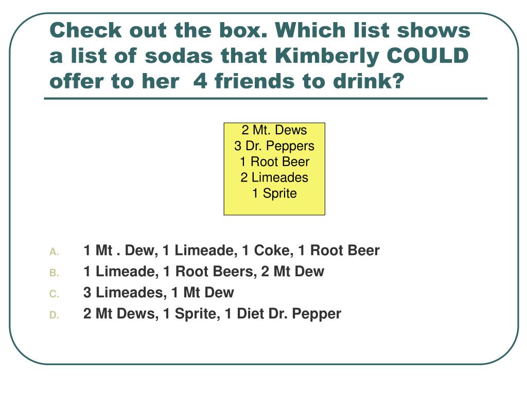 Check out the box. Which list shows a list of sodas that Kimberly COULD offer to her 4 friends to drink? • 1 Mt . Dew, 1 Limeade, 1 Coke, 1 Root Beer • 1 Limeade, 1 Root Beers, 2 Mt Dew • 3 Limeades, 1 Mt Dew • 2 Mt Dews, 1 Sprite, 1 Diet Dr. Pepper 2 Mt. Dews 3 Dr. Peppers 1 Root Beer 2 Limeades 1 Sprite