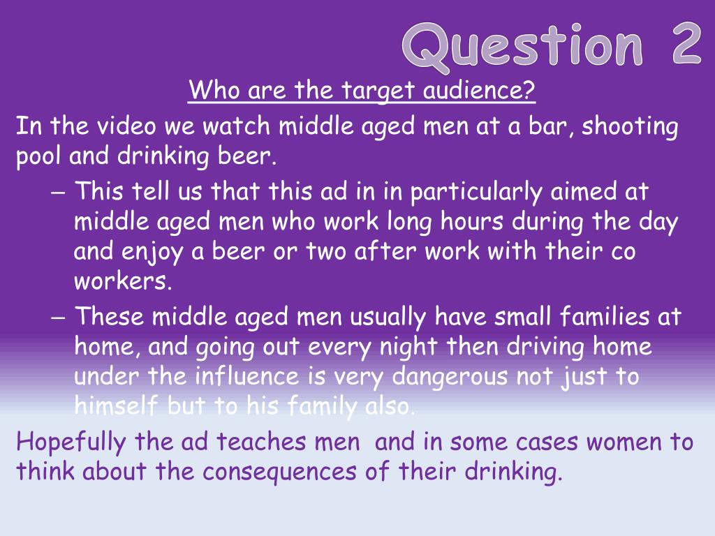 Question 2 Who are the target audience? In the video we watch middle aged men at a bar, shooting pool and drinking beer. • This tell us that this ad in in particularly aimed at middle aged men who work long hours during the day and enjoy a beer or two after work with their co workers. • These middle aged men usually have small families at home, and going out every night then driving home under the influence is very dangerous not just to himself but to his family also. Hopefully the ad teaches men and in some cases women to think about the consequences of their drinking.