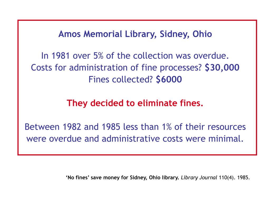Amos Memorial Library, Sidney, Ohio In 1981 over 5% of the collection was overdue. Costs for administration of fine processes? $30,000 Fines collected? $6000 They decided to eliminate fines. Between 1982 and 1985 less than 1% of their resources were overdue and administrative costs were minimal. ‘No fines’ save money for Sidney, Ohio library.Library Journal 110(4). 1985.