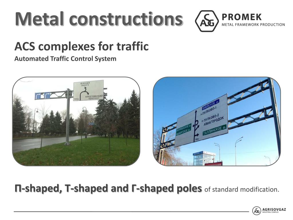 Metal constructions ACS complexes for traffic Automated Traffic Control System Systems are made of shaped tube of various sections from 200 up to 300 mm. The length over the road surface is from 20 up to 26 meters. The construction are also used for the placement of guide signs, road signs, interactive illuminated signs and traffic lights.
