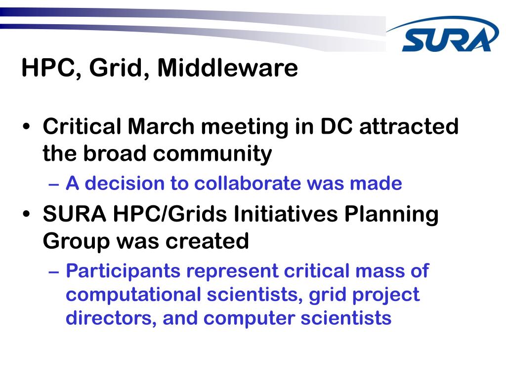 HPC, Grid, Middleware • Critical March meeting in DC attracted the broad community • A decision to collaborate was made • SURA HPC/Grids Initiatives Planning Group was created • Participants represent critical mass of computational scientists, grid project directors, and computer scientists