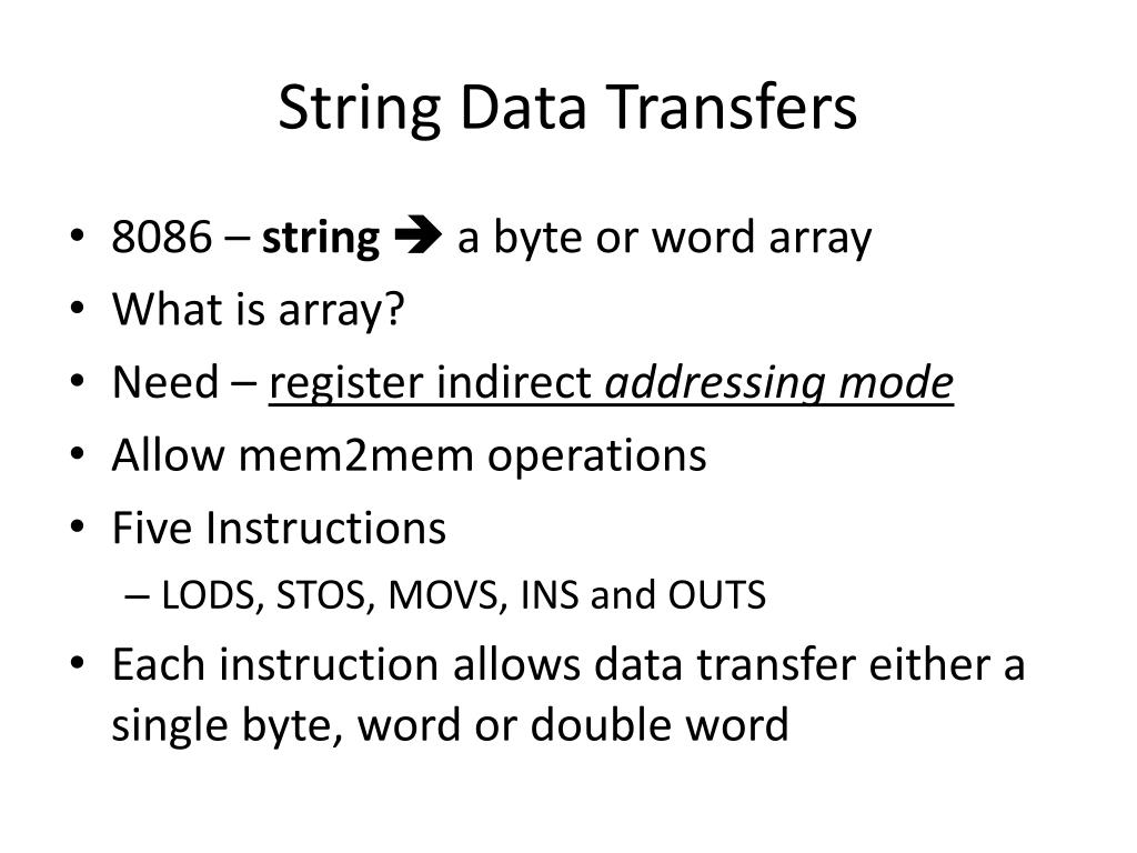 String Data Transfers • 8086 – string a byte or word array • What is array? • Need – register indirect addressing mode • Allow mem2mem operations • Five Instructions • LODS, STOS, MOVS, INS and OUTS • Each instruction allows data transfer either a single byte, word or double word