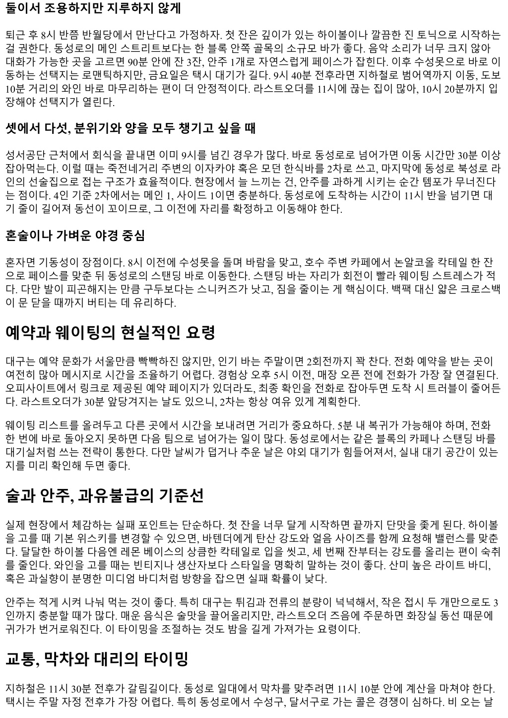 둘이서조용하지만지루하지않게 퇴근후 8시반쯤반월당에서만난다고가정하자. 첫잔은깊이가있는하이볼이나깔끔한진토닉으로시작하는 걸권한다. 동성로의메인스트리트보다는한블록안쪽골목의소규모바가좋다. 음악소리가너무크지않아 대화가가능한곳을고르면 90분안에잔 3잔, 안주 1개로자연스럽게페이스가잡힌다. 이후수성못으로바로이 동하는선택지는로맨틱하지만, 금요일은택시대기가길다. 9시 40분전후라면지하철로범어역까지이동, 도보 10분거리의와인바로마무리하는편이더안정적이다. 라스트오더를 11시에끊는집이많아, 10시 20분까지입 장해야선택지가열린다. 셋에서다섯, 분위기와양을모두챙기고싶을때 성서공단근처에서회식을끝내면이미 9시를넘긴경우가많다. 바로동성로로넘어가면이동시간만 30분이상 잡아먹는다. 이럴때는죽전네거리주변의이자카야혹은모던한식바를 2차로쓰고, 마지막에동성로북성로라 인의선술집으로접는구조가효율적이다. 현장에서늘느끼는건, 안주를과하게시키는순간템포가무너진다 는점이다. 4인기준 2차에서는메인 1, 사이드 1이면충분하다. 동성로에도착하는시간이 11시반을넘기면대 기줄이길어져동선이꼬이므로, 그이전에자리를확정하고이동해야한다. 혼술이나가벼운야경중심 혼자면기동성이장점이다. 8시이전에수성못을돌며바람을맞고, 호수주변카페에서논알코올칵테일한잔 으로페이스를맞춘뒤동성로의스탠딩바로이동한다. 스탠딩바는자리가회전이빨라웨이팅스트레스가적 다. 다만발이피곤해지는만큼구두보다는스니커즈가낫고, 짐을줄이는게핵심이다. 백팩대신얇은크로스백 이문닫을때까지버티는데유리하다. 예약과웨이팅의현실적인요령 대구는예약문화가서울만큼빡빡하진않지만, 인기바는주말이면 2회전까지꽉찬다. 전화예약을받는곳이 여전히많아메시지로시간을조율하기어렵다. 경험상오후 5시이전, 매장오픈전에전화가가장잘연결된다. 오피사이트에서링크로제공된예약페이지가있더라도, 최종확인을전화로잡아두면도착시트러블이줄어든 다. 라스트오더가 30분앞당겨지는날도있으니, 2차는항상여유있게계획한다. 웨이팅리스트를올려두고다른곳에서시간을보내려면거리가중요하다. 5분내복귀가가능해야하며, 전화 한번에바로돌아오지못하면다음팀으로넘어가는일이많다. 동성로에서는같은블록의카페나스탠딩바를 대기실처럼쓰는전략이통한다. 다만날씨가덥거나추운날은야외대기가힘들어져서, 실내대기공간이있는 지를미리확인해두면좋다. 술과안주, 과유불급의기준선 실제현장에서체감하는실패포인트는단순하다. 첫잔을너무달게시작하면끝까지단맛을좇게된다. 하이볼 을고를때기본위스키를변경할수있으면, 바텐더에게탄산강도와얼음사이즈를함께요청해밸런스를맞춘 다. 달달한하이볼다음엔레몬베이스의상큼한칵테일로입을씻고, 세번째잔부터는강도를올리는편이숙취 를줄인다. 와인을고를때는빈티지나생산자보다스타일을명확히말하는것이좋다. 산미높은라이트바디, 혹은과실향이분명한미디엄바디처럼방향을잡으면실패확률이낮다. 안주는적게시켜나눠먹는것이좋다. 특히대구는튀김과전류의분량이넉넉해서, 작은접시두개만으로도 3 인까지충분할때가많다. 매운음식은술맛을끌어올리지만, 라스트오더즈음에주문하면화장실동선때문에 귀가가번거로워진다. 이타이밍을조절하는것도밤을길게가져가는요령이다. 교통, 막차와대리의타이밍 지하철은 11시 30분전후가갈림길이다. 동성로일대에서막차를맞추려면 11시 10분안에계산을마쳐야한다. 택시는주말자정전후가가장어렵다. 특히동성로에서수성구, 달서구로가는콜은경쟁이심하다. 비오는날