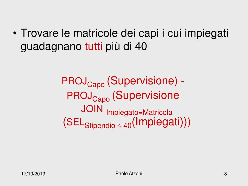 Trovare le matricole dei capi i cui impiegati guadagnano tutti più di 40 • PROJCapo (Supervisione) - • PROJCapo (Supervisione JOINImpiegato=Matricola (SELStipendio 40(Impiegati))) Paolo Atzeni