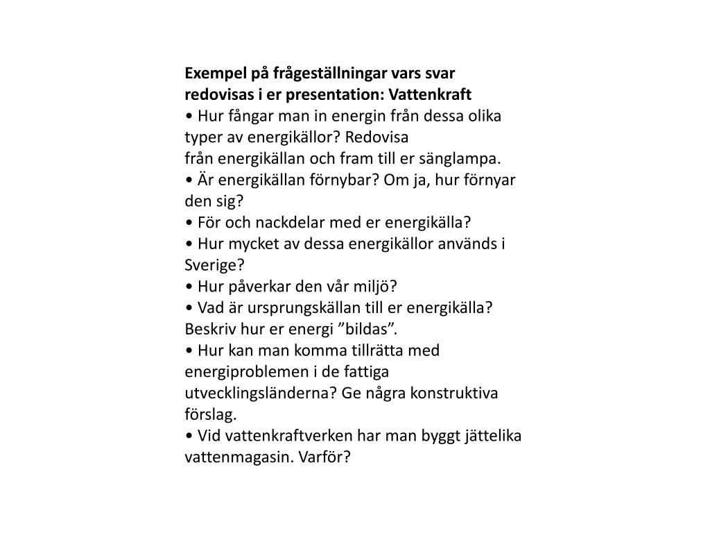 Exempel på frågeställningar vars svar redovisas i er presentation: Vattenkraft • Hur fångar man in energin från dessa olika typer av energikällor? Redovisa från energikällan och fram till er sänglampa. • Är energikällan förnybar? Om ja, hur förnyar den sig? • För och nackdelar med er energikälla? • Hur mycket av dessa energikällor används i Sverige? • Hur påverkar den vår miljö? • Vad är ursprungskällan till er energikälla? Beskriv hur er energi ”bildas”. • Hur kan man komma tillrätta med energiproblemen i de fattiga utvecklingsländerna? Ge några konstruktiva förslag. • Vid vattenkraftverken har man byggt jättelika vattenmagasin. Varför?