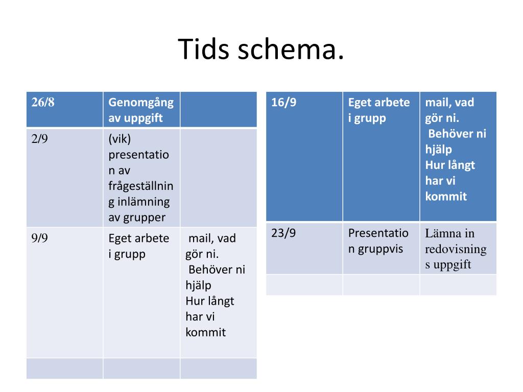 Till nästa gång Frågeställning 2 sept • Lämna in frågeställningar • Gruppvis. • Skall vara skrivet i Word • Presentera också vem som skall göra vad .