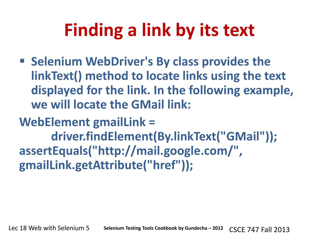 Finding a link by its text • Selenium WebDriver's By class provides the linkText() method to locate links using the text displayed for the link. In the following example, we will locate the GMail link: WebElementgmailLink = driver.findElement(By.linkText("GMail")); assertEquals("http://mail.google.com/", gmailLink.getAttribute("href")); Selenium Testing Tools Cookbook by Gundecha – 2012
