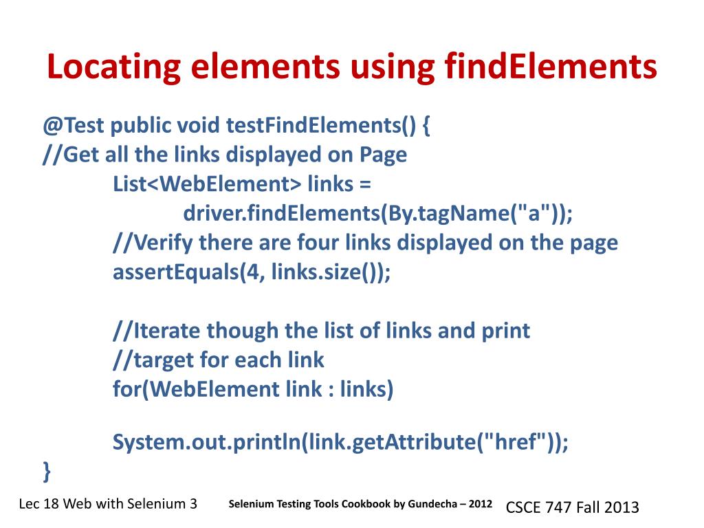 Locating elements using findElements @Test public void testFindElements() { //Get all the links displayed on Page List<WebElement> links = driver.findElements(By.tagName("a")); //Verify there are four links displayed on the page assertEquals(4, links.size()); //Iterate though the list of links and print //target for each link for(WebElement link : links) System.out.println(link.getAttribute("href")); } Selenium Testing Tools Cookbook by Gundecha – 2012