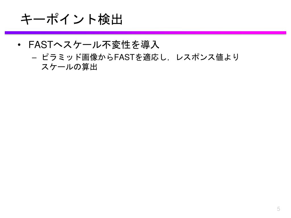 キーポイント検出:FASTへスケール不変性導入キーポイント検出:FASTへスケール不変性導入 • 入力画像からピラミッド画像生成 • FASTを適応 • 各特徴点よりレスポンス値Vの算出 • レスポンス値の最大値をスケールとする