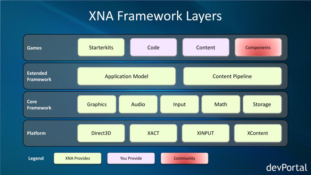 XNA Framework Layers Games Starterkits Code Content Components Extended Framework Application Model Content Pipeline Core Framework Graphics Audio Input Math Storage Platform Direct3D XACT XINPUT XContent XNA Provides You Provide Community Legend