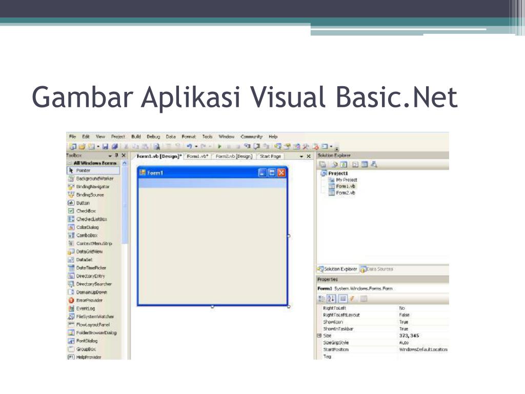 Apa Itu VB.NET ? • VB.NET adalah salah satu bahasa pemrograman Komputer Tingkat Tinggi. • Bahasa Pemrograman Adalah Perintah-perintah yang dimengerti oleh computer untuk melakukan tugas-tugas tertentu. • Bahasa pemrograman VB.NET dikembangkan oleh Microsoft , Merupakan Salah Satu bahasa Pemrograman Yang Object Oriented Program(OOP) atau Pemrograman yang berorientasi Pada Object.
