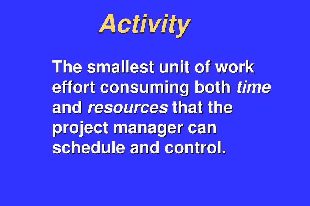 Activity The smallest unit of work effort consuming both time and resources that the project manager can schedule and control.
