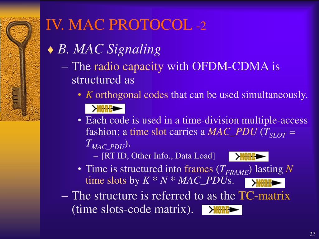 IV. MAC PROTOCOL -2 • B. MAC Signaling • The radio capacity with OFDM-CDMA is structured as • Korthogonal codes that can be used simultaneously. • Each code is used in a time-division multiple-access fashion; a time slot carries a MAC_PDU (TSLOT = TMAC_PDU). • [RT ID, Other Info., Data Load] • Time is structured into frames (TFRAME) lasting N time slots by K * N * MAC_PDUs. • The structure is referred to as the TC-matrix (time slots-code matrix).