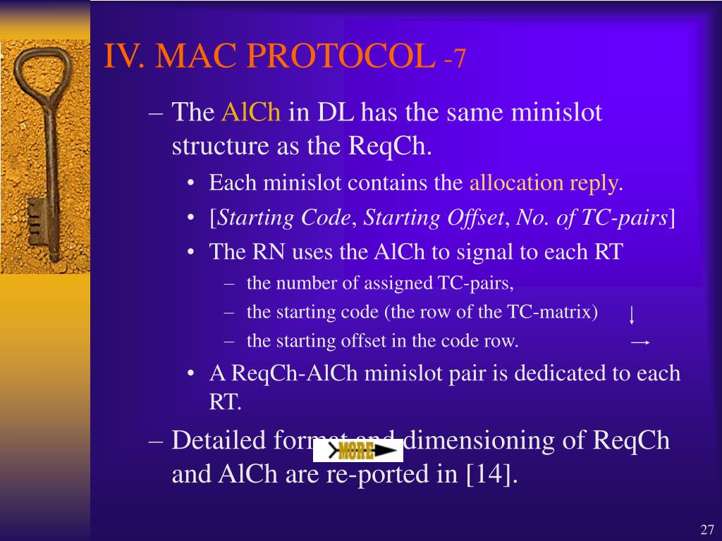 IV. MAC PROTOCOL -7 • The AlCh in DL has the same minislot structure as the ReqCh. • Each minislot contains the allocation reply. • [Starting Code, Starting Offset, No. of TC-pairs] • The RN uses the AlCh to signal to each RT • the number of assigned TC-pairs, • the starting code (the row of the TC-matrix) • the starting offset in the code row. • A ReqCh-AlCh minislot pair is dedicated to each RT. • Detailed format and dimensioning of ReqCh and AlCh are re-ported in [14].