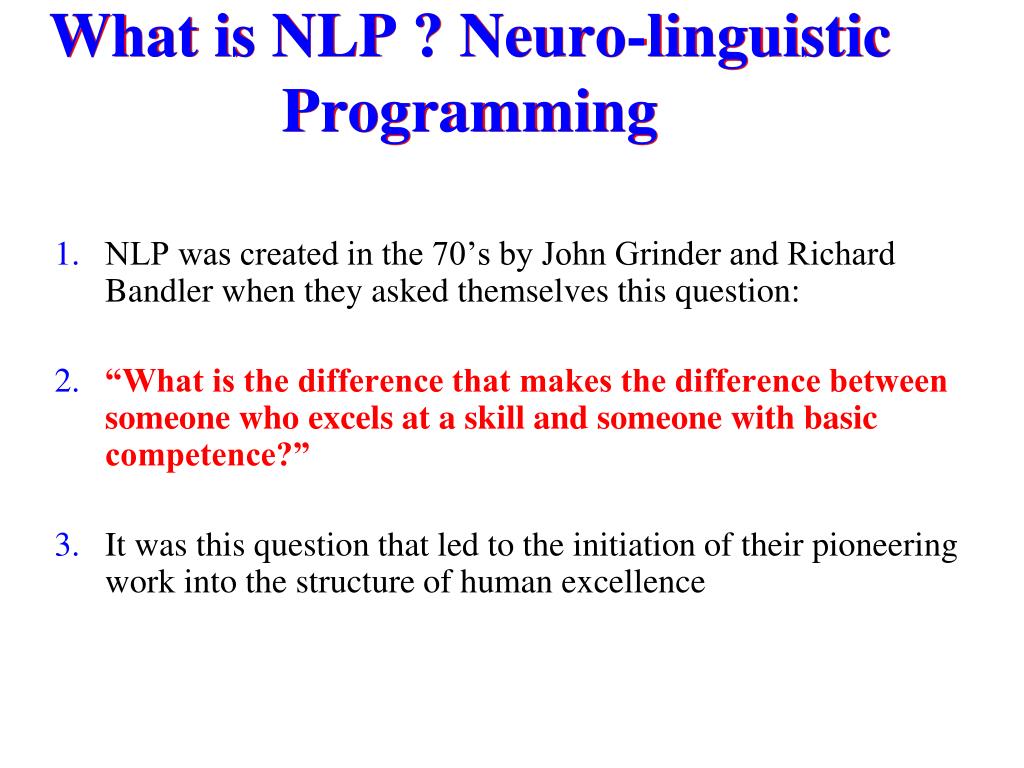 What is NLP ? Neuro-linguistic Programming • NLP was created in the 70’s by John Grinder and Richard Bandler when they asked themselves this question: • “What is the difference that makes the difference between someone who excels at a skill and someone with basic competence?” • It was this question that led to the initiation of their pioneering work into the structure of human excellence
