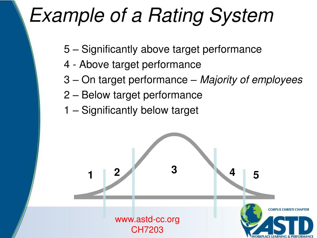 Example of a Rating System 3 2 4 1 5 5 – Significantly above target performance 4 - Above target performance 3 – On target performance – Majority of employees 2 – Below target performance 1 – Significantly below target