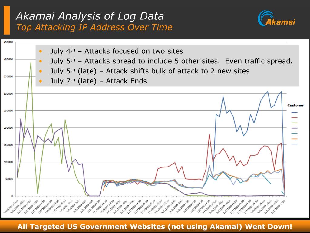 Akamai Analysis of Log Data Top Attacking IP Address Over Time • July 4th – Attacks focused on two sites • July 5th – Attacks spread to include 5 other sites. Even traffic spread. • July 5th (late) – Attack shifts bulk of attack to 2 new sites • July 7th (late) – Attack Ends All Targeted US Government Websites (not using Akamai) Went Down!