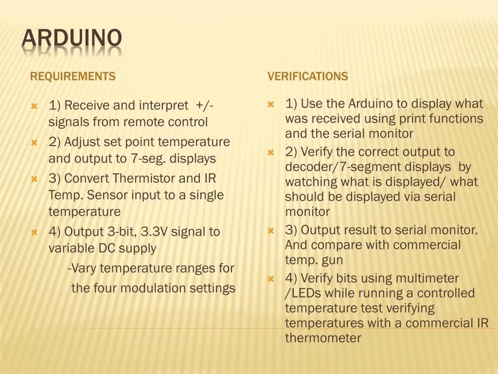 Requirements Verifications • 1) Receive and interpret +/- signals from remote control • 2) Adjust set point temperature and output to 7-seg. displays • 3) Convert Thermistor and IR Temp. Sensor input to a single temperature • 4) Output 3-bit, 3.3V signal to variable DC supply -Vary temperature ranges for the four modulation settings • 1) Use the Arduino to display what was received using print functions and the serial monitor • 2) Verify the correct output to decoder/7-segment displays by watching what is displayed/ what should be displayed via serial monitor • 3) Output result to serial monitor. And compare with commercial temp. gun • 4) Verify bits using multimeter/LEDs while running a controlled temperature test verifying temperatures with a commercial IR thermometer Arduino