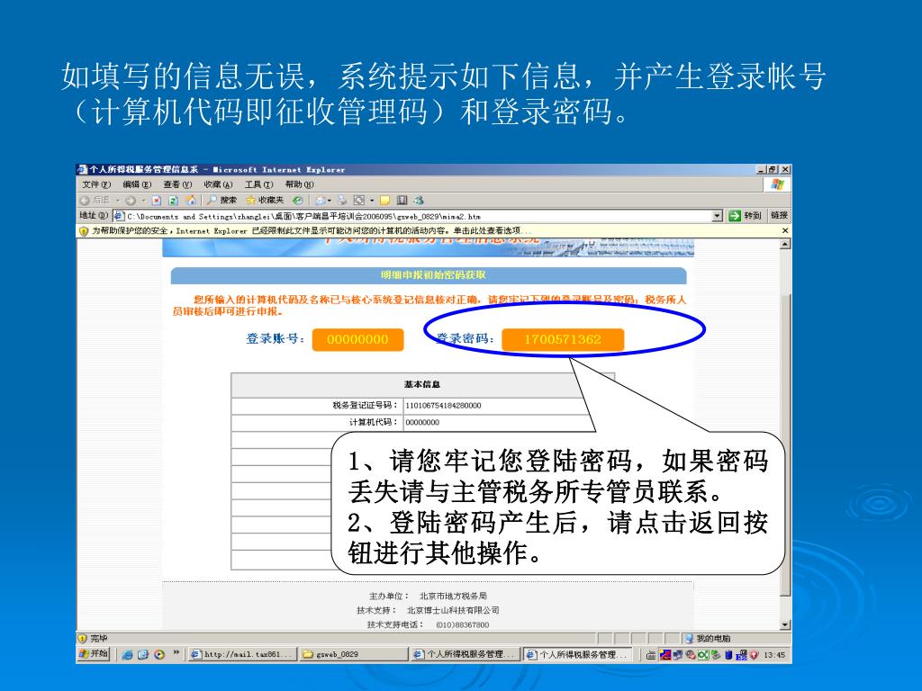 如填写的信息无误,系统提示如下信息,并产生登录帐号(计算机代码即征收管理码)和登录密码。如填写的信息无误,系统提示如下信息,并产生登录帐号(计算机代码即征收管理码)和登录密码。 1、请您牢记您登陆密码,如果密码丢失请与主管税务所专管员联系。 2、登陆密码产生后,请点击返回按钮进行其他操作。