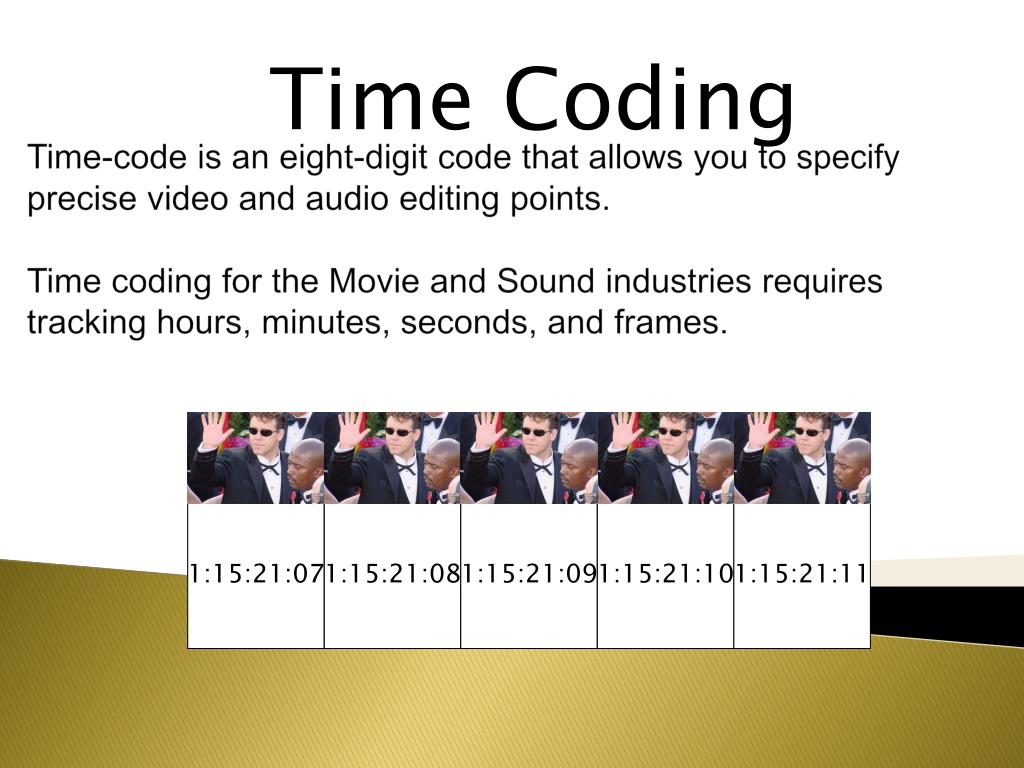 Time-code is an eight-digit code that allows you to specify precise video and audio editing points.Time coding for the Movie and Sound industries requires tracking hours, minutes, seconds, and frames. Time Coding 1:15:21:07 1:15:21:08 1:15:21:09 1:15:21:10 1:15:21:11