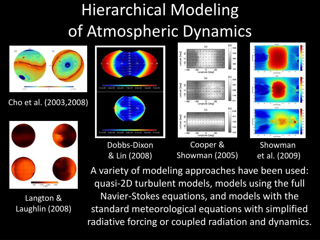 Hierarchical Modeling of Atmospheric Dynamics Cho et al. (2003,2008) Cooper & Showman (2005) Dobbs-Dixon & Lin (2008) Showman et al. (2009) A variety of modeling approaches have been used: quasi-2D turbulent models, models using the full Navier-Stokes equations, and models with the standard meteorological equations with simplified radiative forcing or coupled radiation and dynamics. Langton & Laughlin (2008)