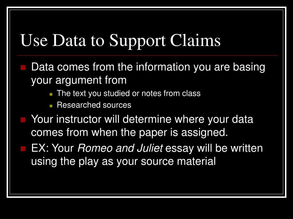 Use Data to Support Claims • Data comes from the information you are basing your argument from • The text you studied or notes from class • Researched sources • Your instructor will determine where your data comes from when the paper is assigned. • EX: Your Romeo and Juliet essay will be written using the play as your source material
