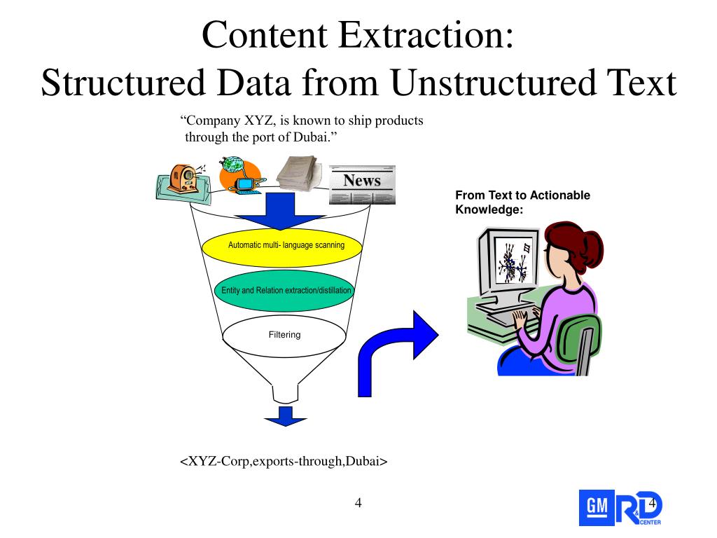 Content Extraction:Structured Data from Unstructured Text “Company XYZ, is known to ship products through the port of Dubai.” From Text to Actionable Knowledge: Automatic multi- language scanning Entity and Relation extraction/distillation Filtering <XYZ-Corp,exports-through,Dubai> 4