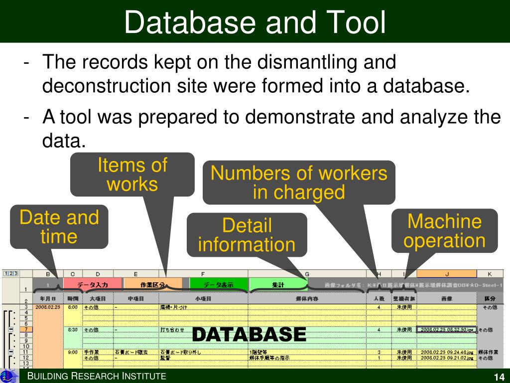 Database and Tool • The records kept on the dismantling and deconstruction site were formed into a database. • A tool was prepared to demonstrate and analyze the data. Items of works Numbers of workers in charged Date and time Machine operation Detail information DATABASE