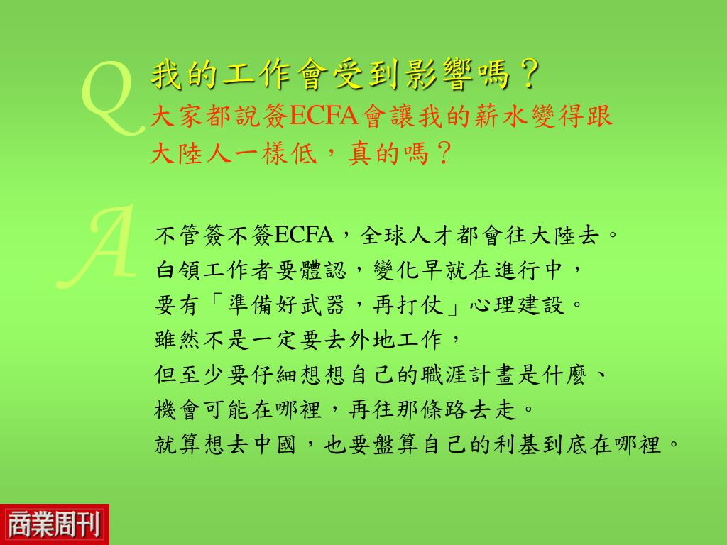 我的工作會受到影響嗎?大家都說簽ECFA會讓我的薪水變得跟大陸人一樣低,真的嗎?我的工作會受到影響嗎?大家都說簽ECFA會讓我的薪水變得跟大陸人一樣低,真的嗎? Q 不管簽不簽ECFA,全球人才都會往大陸去。 白領工作者要體認,變化早就在進行中, 要有「準備好武器,再打仗」心理建設。 雖然不是一定要去外地工作, 但至少要仔細想想自己的職涯計畫是什麼、 機會可能在哪裡,再往那條路去走。 就算想去中國,也要盤算自己的利基到底在哪裡。 A