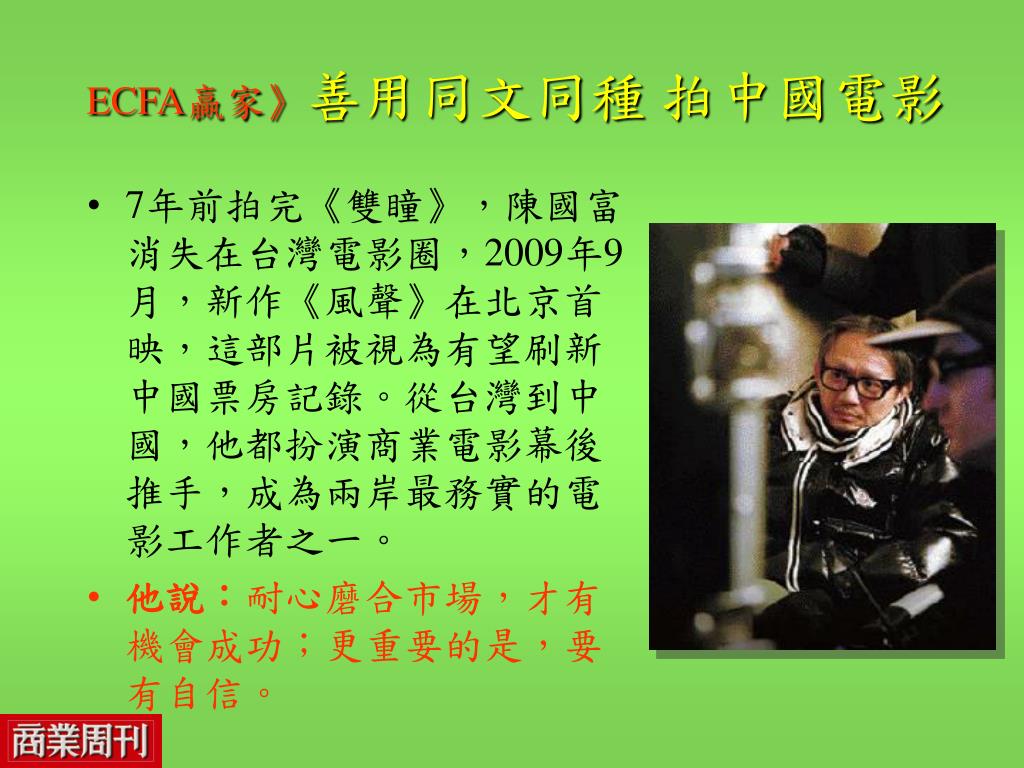ECFA贏家》善用同文同種 拍中國電影 • 7年前拍完《雙瞳》,陳國富消失在台灣電影圈,2009年9月,新作《風聲》在北京首映,這部片被視為有望刷新中國票房記錄。從台灣到中國,他都扮演商業電影幕後推手,成為兩岸最務實的電影工作者之一。 • 他說:耐心磨合市場,才有機會成功;更重要的是,要有自信。