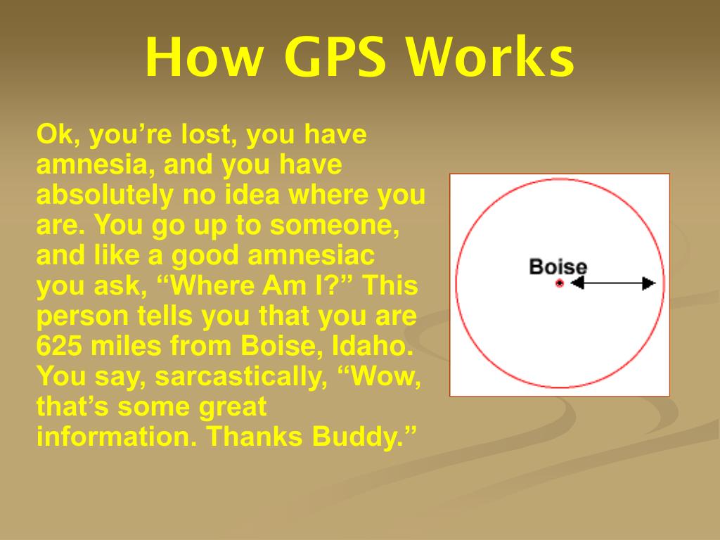 How GPS Works • Ok, you’re lost, you have amnesia, and you have absolutely no idea where you are. You go up to someone, and like a good amnesiac you ask, “Where Am I?” This person tells you that you are 625 miles from Boise, Idaho. You say, sarcastically, “Wow, that’s some great information. Thanks Buddy.”