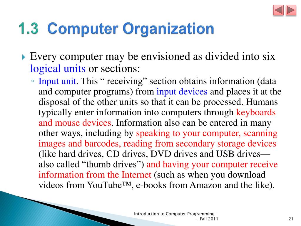 1.3 Computer Organization • Every computer may be envisioned as divided into six logical units or sections: • Input unit. This “ receiving” section obtains information (data and computer programs) from input devicesand places it at the disposal of the other units so that it can be processed. Humans typically enter information into computers through keyboards and mouse devices. Information also can be entered in many other ways, including by speaking to your computer, scanning images and barcodes, reading from secondary storage devices (like hard drives, CD drives, DVD drives and USB drives—also called “thumb drives”) and having your computer receive information from the Internet (such as when you download videos from YouTube™, e-books from Amazon and the like). Introduction to Computer Programming -- Fall 2011