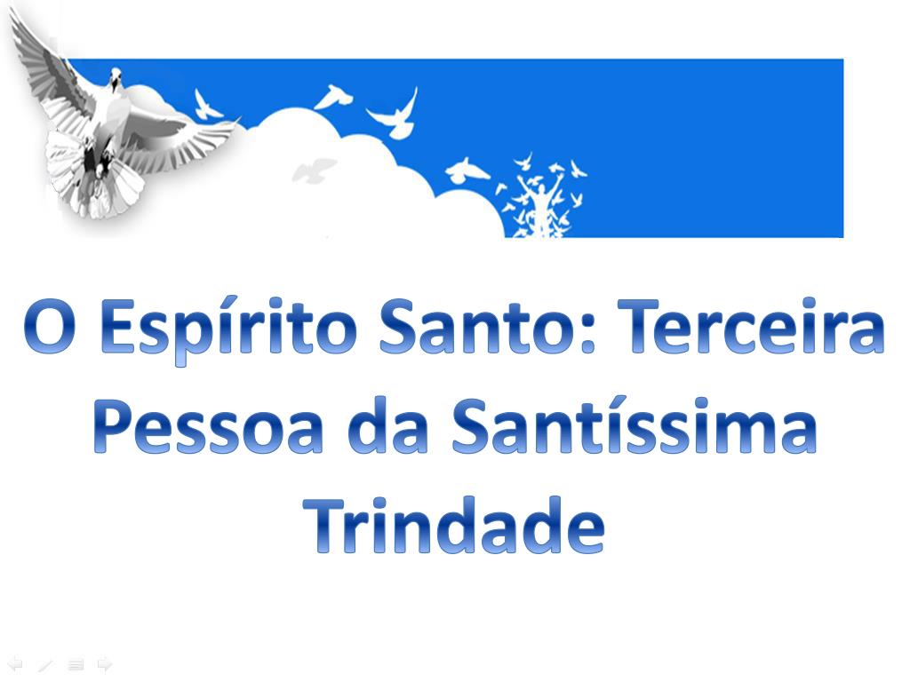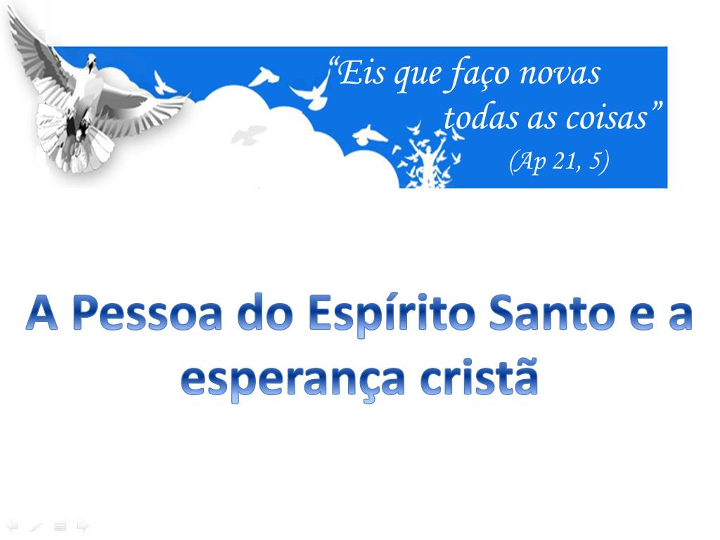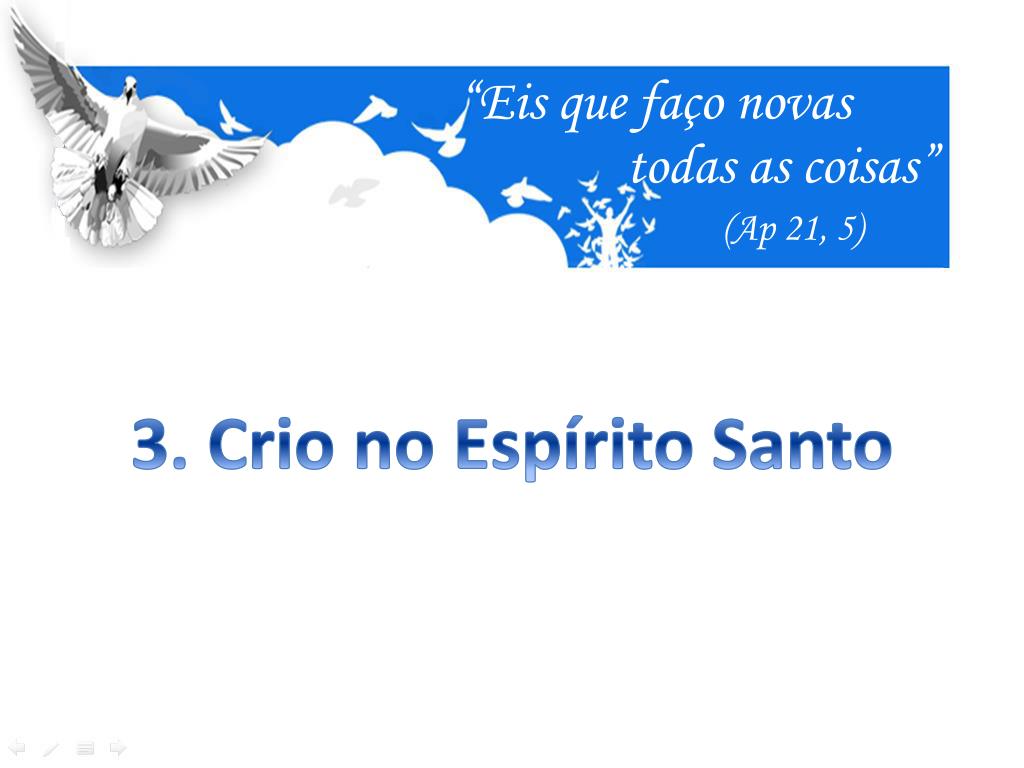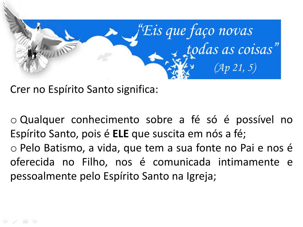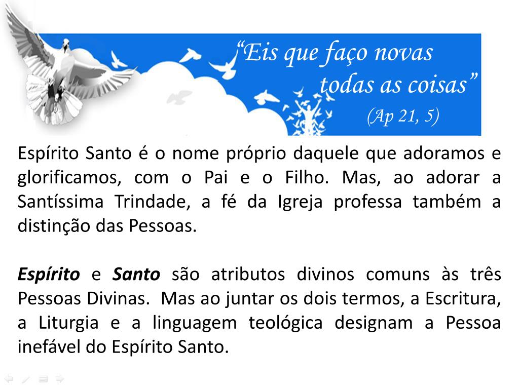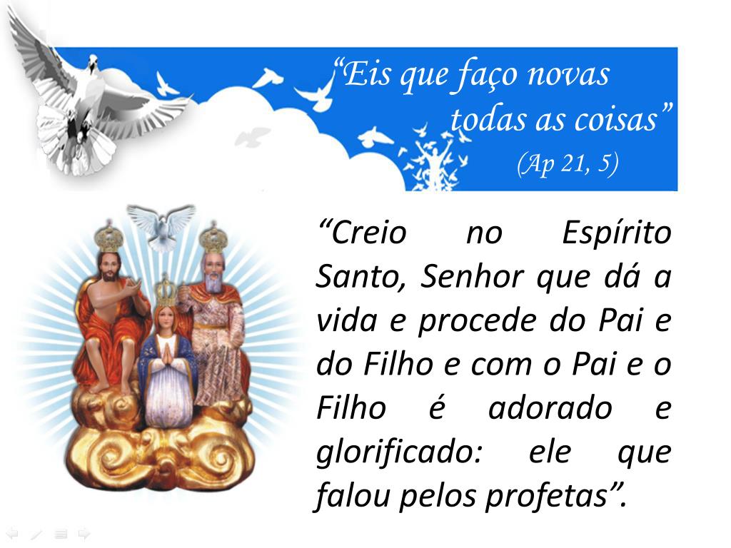 O Espírito Santo: Terceira Pessoa da Santíssima Trindade. “Eis que faço novas. todas as coisas”. ( Ap 21, 5). “Creio no Espírito Santo, Senhor que dá a vida e procede do Pai e do Filho e com o Pai e o Filho é adorado e glorificado: ele que falou pelos profetas”. “Eis que faço novas.