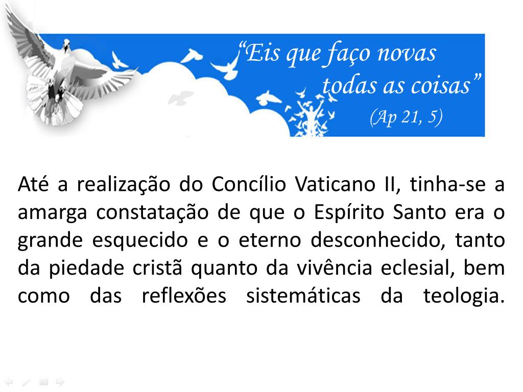 “Eis que faço novas todas as coisas” (Ap 21, 5) Até a realização do Concílio Vaticano II, tinha-se a amarga constatação de que o Espírito Santo era o grande esquecido e o eterno desconhecido, tanto da piedade cristã quanto da vivência eclesial, bem como das reflexões sistemáticas da teologia.