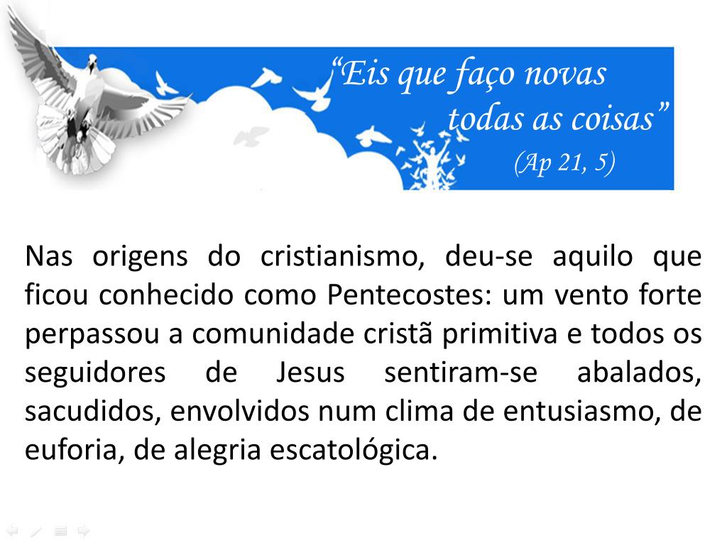 “Eis que faço novas todas as coisas” (Ap 21, 5) Nas origens do cristianismo, deu-se aquilo que ficou conhecido como Pentecostes: um vento forte perpassou a comunidade cristã primitiva e todos os seguidores de Jesus sentiram-se abalados, sacudidos, envolvidos num clima de entusiasmo, de euforia, de alegria escatológica.