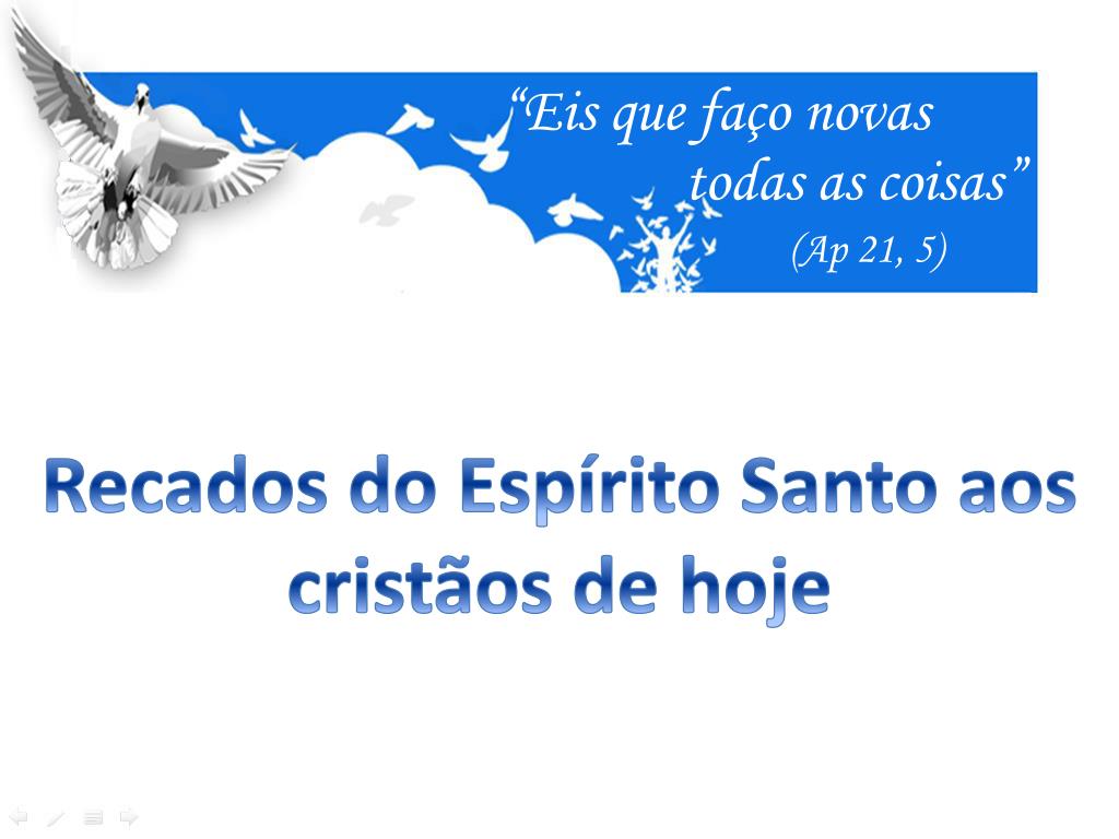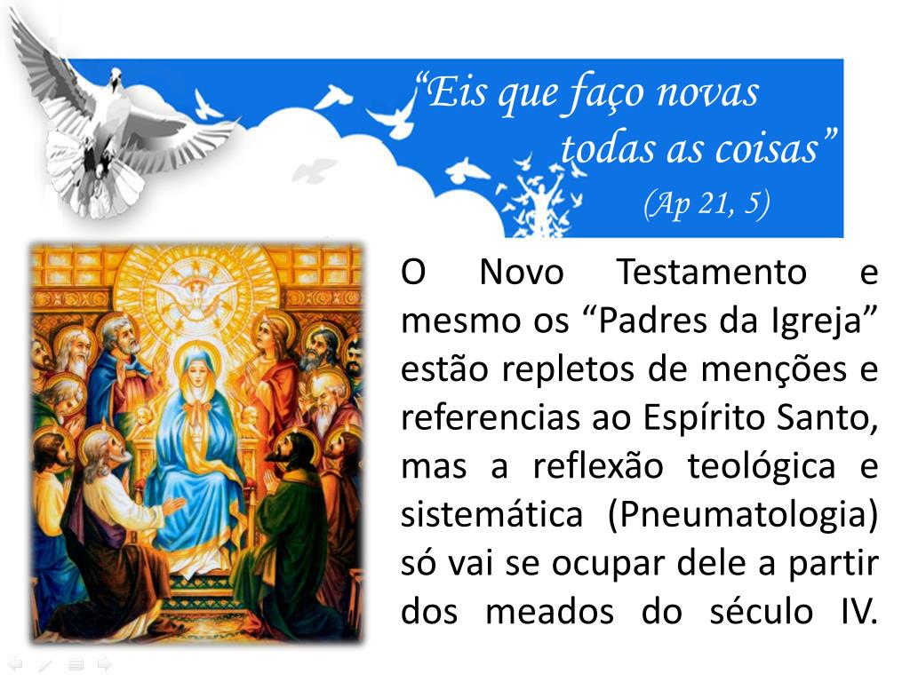 “Eis que faço novas todas as coisas” (Ap 21, 5) O Novo Testamento e mesmo os “Padres da Igreja” estão repletos de menções e referencias ao Espírito Santo, mas a reflexão teológica e sistemática (Pneumatologia) só vai se ocupar dele a partir dos meados do século IV.