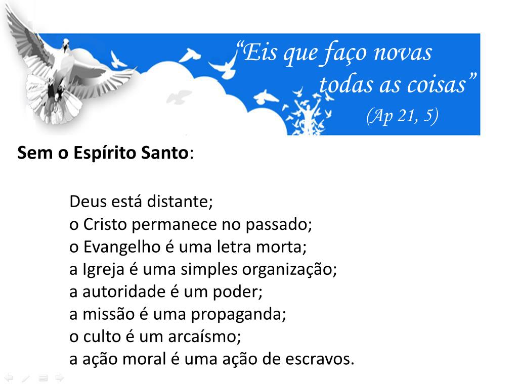“Eis que faço novas todas as coisas” (Ap 21, 5) Sem o Espírito Santo: Deus está distante; o Cristo permanece no passado; o Evangelho é uma letra morta; a Igreja é uma simples organização; a autoridade é um poder; a missão é uma propaganda; o culto é um arcaísmo; a ação moral é uma ação de escravos.