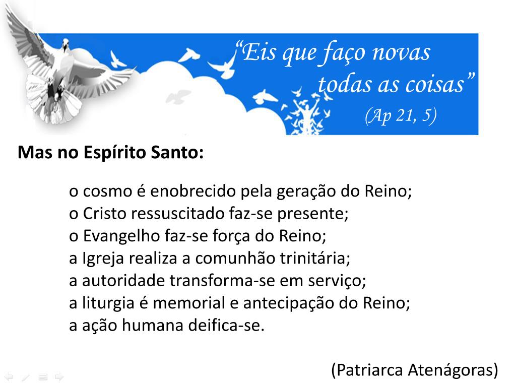 “Eis que faço novas todas as coisas” (Ap 21, 5) Mas no Espírito Santo: o cosmo é enobrecido pela geração do Reino; o Cristo ressuscitado faz-se presente; o Evangelho faz-se força do Reino; a Igreja realiza a comunhão trinitária; a autoridade transforma-se em serviço; a liturgia é memorial e antecipação do Reino; a ação humana deifica-se. (Patriarca Atenágoras)