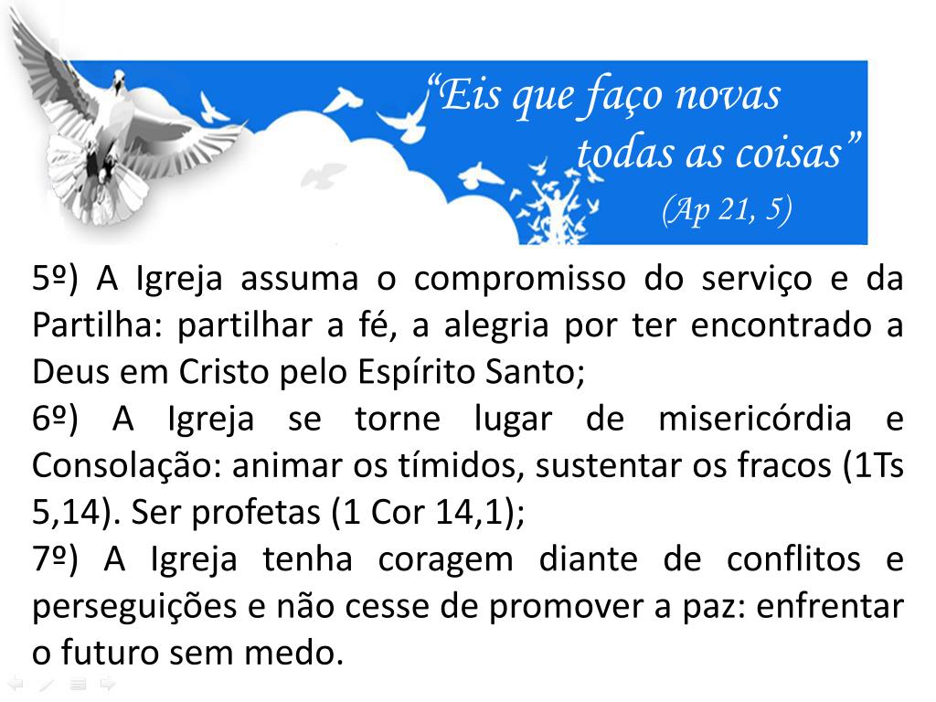 “Eis que faço novas todas as coisas” (Ap 21, 5) 5º) A Igreja assuma o compromisso do serviço e da Partilha: partilhar a fé, a alegria por ter encontrado a Deus em Cristo pelo Espírito Santo; 6º) A Igreja se torne lugar de misericórdia e Consolação: animar os tímidos, sustentar os fracos (1Ts 5,14). Ser profetas (1 Cor 14,1); 7º) A Igreja tenha coragem diante de conflitos e perseguições e não cesse de promover a paz: enfrentar o futuro sem medo.