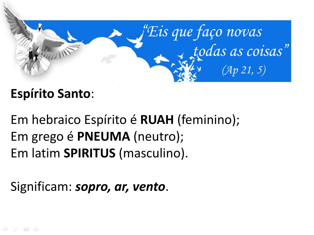 “Eis que faço novas todas as coisas” (Ap 21, 5) Espírito Santo: Em hebraico Espírito é RUAH (feminino); Em grego é PNEUMA (neutro); Em latim SPIRITUS (masculino). Significam: sopro, ar, vento.