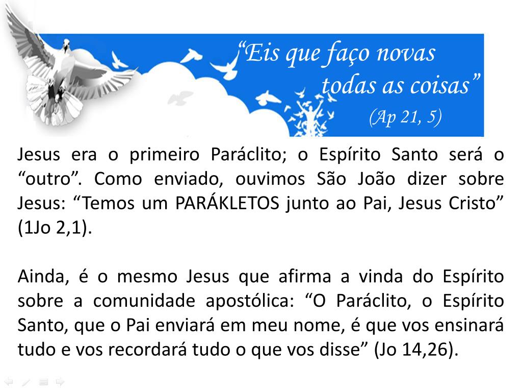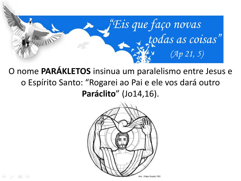 “Eis que faço novas todas as coisas” (Ap 21, 5) O nome PARÁKLETOS insinua um paralelismo entre Jesus e o Espírito Santo: “Rogarei ao Pai e ele vos dará outro Paráclito” (Jo14,16).