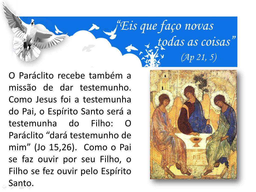 “Eis que faço novas todas as coisas” (Ap 21, 5) O Paráclito recebe também a missão de dar testemunho. Como Jesus foi a testemunha do Pai, o Espírito Santo será a testemunha do Filho: O Paráclito “dará testemunho de mim” (Jo 15,26). Como o Pai se faz ouvir por seu Filho, o Filho se fez ouvir pelo Espírito Santo.