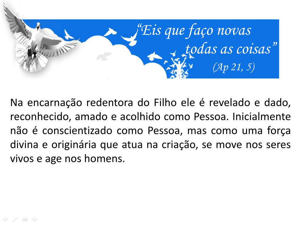 “Eis que faço novas todas as coisas” (Ap 21, 5) Na encarnação redentora do Filho ele é revelado e dado, reconhecido, amado e acolhido como Pessoa. Inicialmente não é conscientizado como Pessoa, mas como uma força divina e originária que atua na criação, se move nos seres vivos e age nos homens.