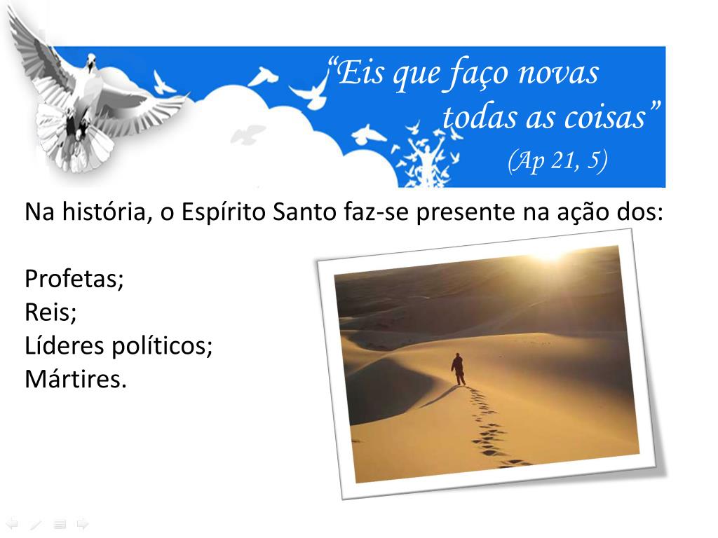 “Eis que faço novas todas as coisas” (Ap 21, 5) Na história, o Espírito Santo faz-se presente na ação dos: Profetas; Reis; Líderes políticos; Mártires.