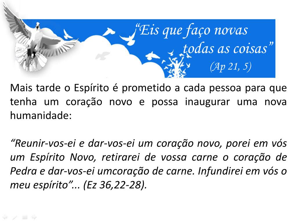 “Eis que faço novas todas as coisas” (Ap 21, 5) Mais tarde o Espírito é prometido a cada pessoa para que tenha um coração novo e possa inaugurar uma nova humanidade: “Reunir-vos-ei e dar-vos-ei um coração novo, porei em vós um Espírito Novo, retirarei de vossa carne o coração de Pedra e dar-vos-ei umcoração de carne. Infundirei em vós o meu espírito”... (Ez 36,22-28).