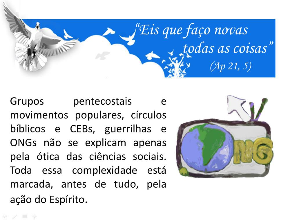 “Eis que faço novas todas as coisas” (Ap 21, 5) Grupos pentecostais e movimentos populares, círculos bíblicos e CEBs, guerrilhas e ONGs não se explicam apenas pela ótica das ciências sociais. Toda essa complexidade está marcada, antes de tudo, pela ação do Espírito.