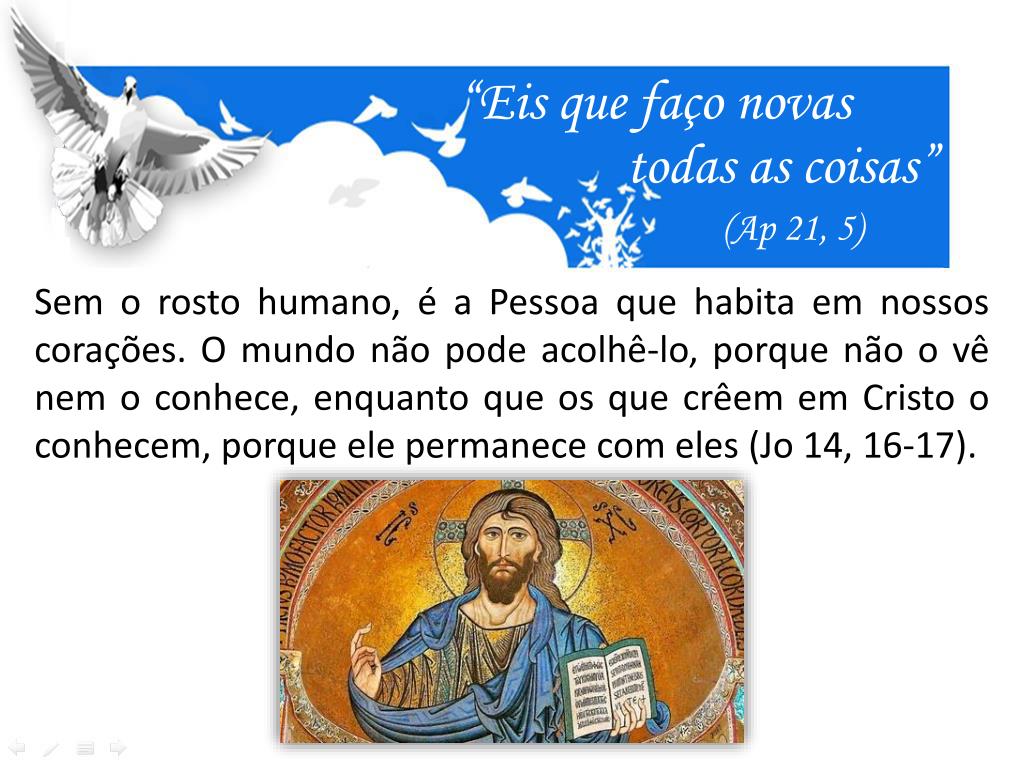 “Eis que faço novas todas as coisas” (Ap 21, 5) Sem o rosto humano, é a Pessoa que habita em nossos corações. O mundo não pode acolhê-lo, porque não o vê nem o conhece, enquanto que os que crêem em Cristo o conhecem, porque ele permanece com eles (Jo 14, 16-17).