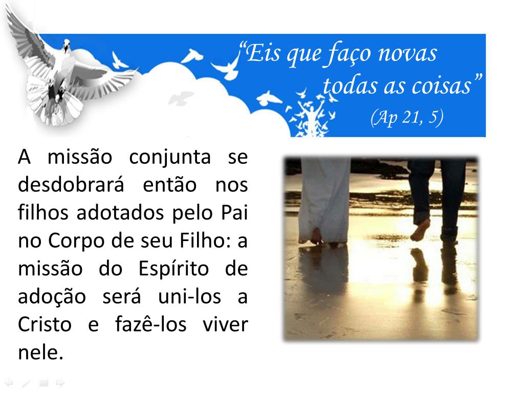 “Eis que faço novas todas as coisas” (Ap 21, 5) A missão conjunta se desdobrará então nos filhos adotados pelo Pai no Corpo de seu Filho: a missão do Espírito de adoção será uni-los a Cristo e fazê-los viver nele.
