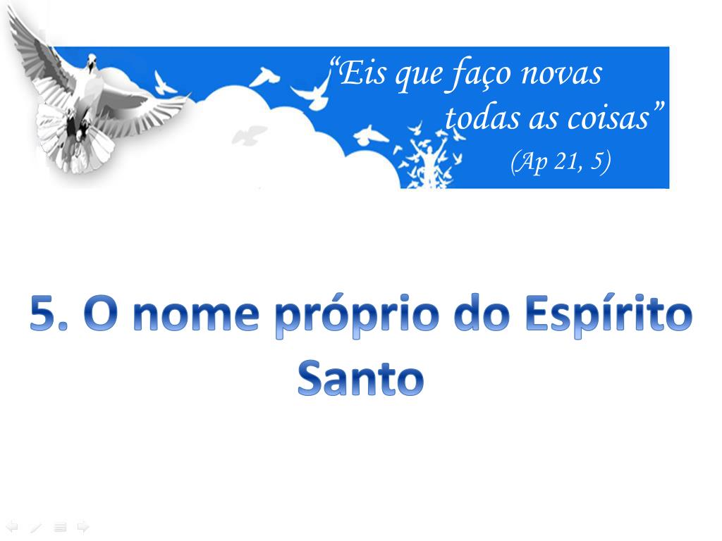 “Eis que faço novas todas as coisas” (Ap 21, 5) Ainda, é chama do de: Espírito de verdade (Jo 16,13); Espírito da promessa (Gl 3,14; Ef 1,13); Espírito de adoção (Rm 8,15; Gl 4,6); Espírito de Cristo (Rm 8,11); Espírito do Senhor(2 Cor 3,17); Espírito de Deus (Rm 8,9.14; 15,19; 1Cor 6,11; 7,40); Espírito da Glória (1 Pd 4,14).